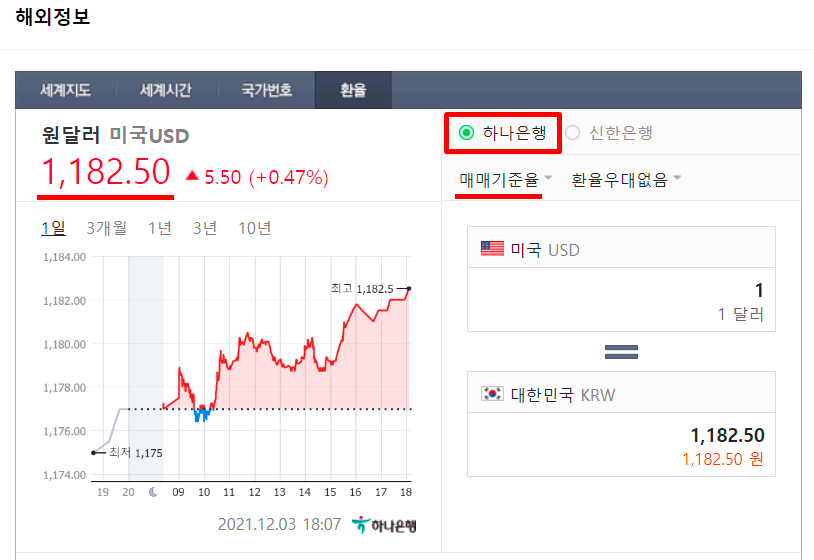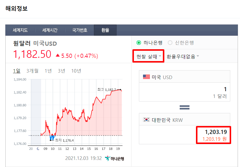 현찰/전신 환매매를 하나은행의 자체 환율을 기준으로 비교해보면, 현찰로 달러를 구입할 때 환전 스프레드의 값이 높아 1,203.19원까지 올라갑니다.