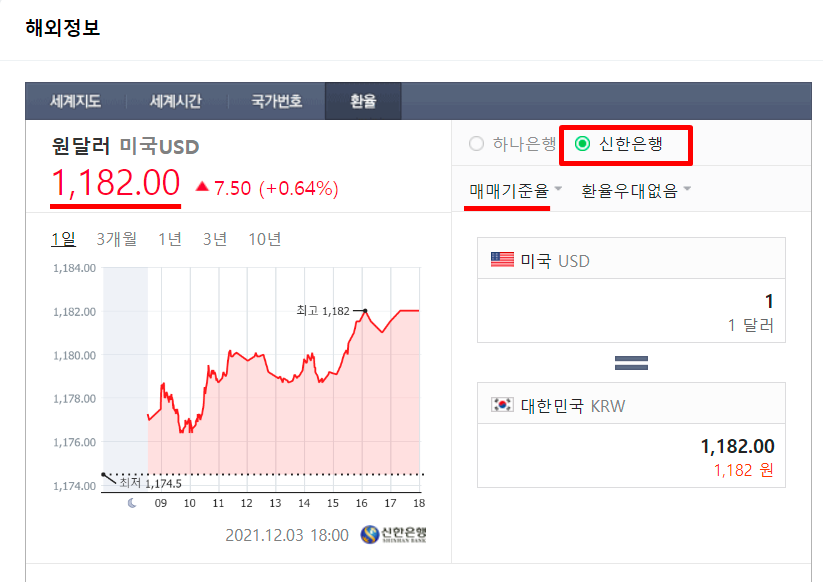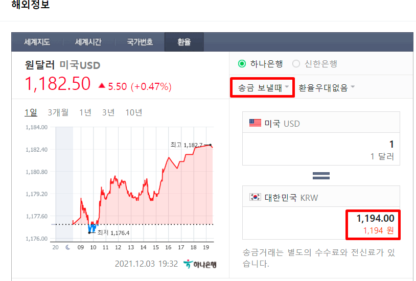 전산상 달러를 구입할 때(송금 보낼 때)는 환전 스프레드의 값이 보다 낮아 1,194.00원이 됩니다.
