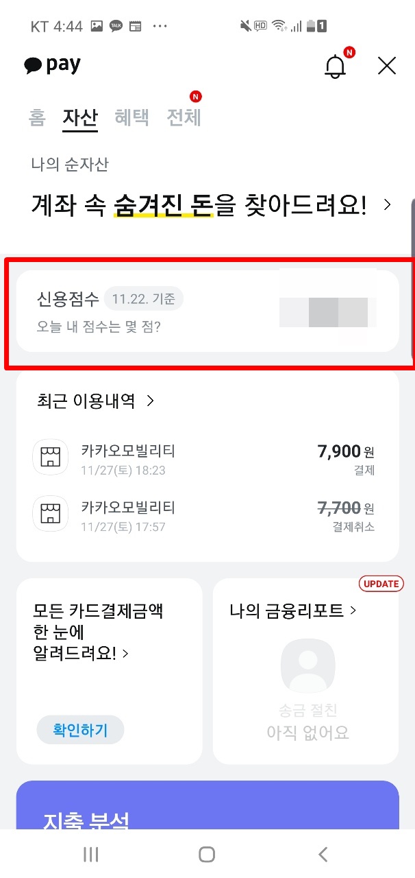 나이스나 올크레딧 신용평가사의 어플을 직접 다운로드하여 확인 가능하지만, 가장 간편하게는 카카오톡으로 내 신용점수를 알 수 있습니다.