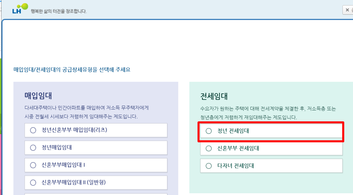 LH에서 대학생·취업준비생·만 19~39세의 청년층의 주거비 완화를 위해 기존 주택을 저렴하게 재임대해주는 사업입니다. 청약처럼 새 아파트를 짓는 것이 아닌 기존의 주택으로 전세계약을 체결하여 청년 대상자에게 재임대해주는 것이죠.