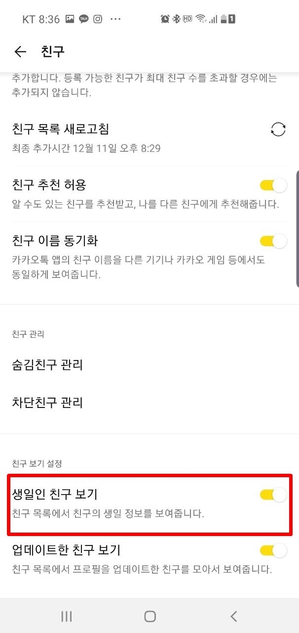 반대로 카톡에 등록된 친구들의 생일이 안 뜨게도 설정할 수 있습니다.