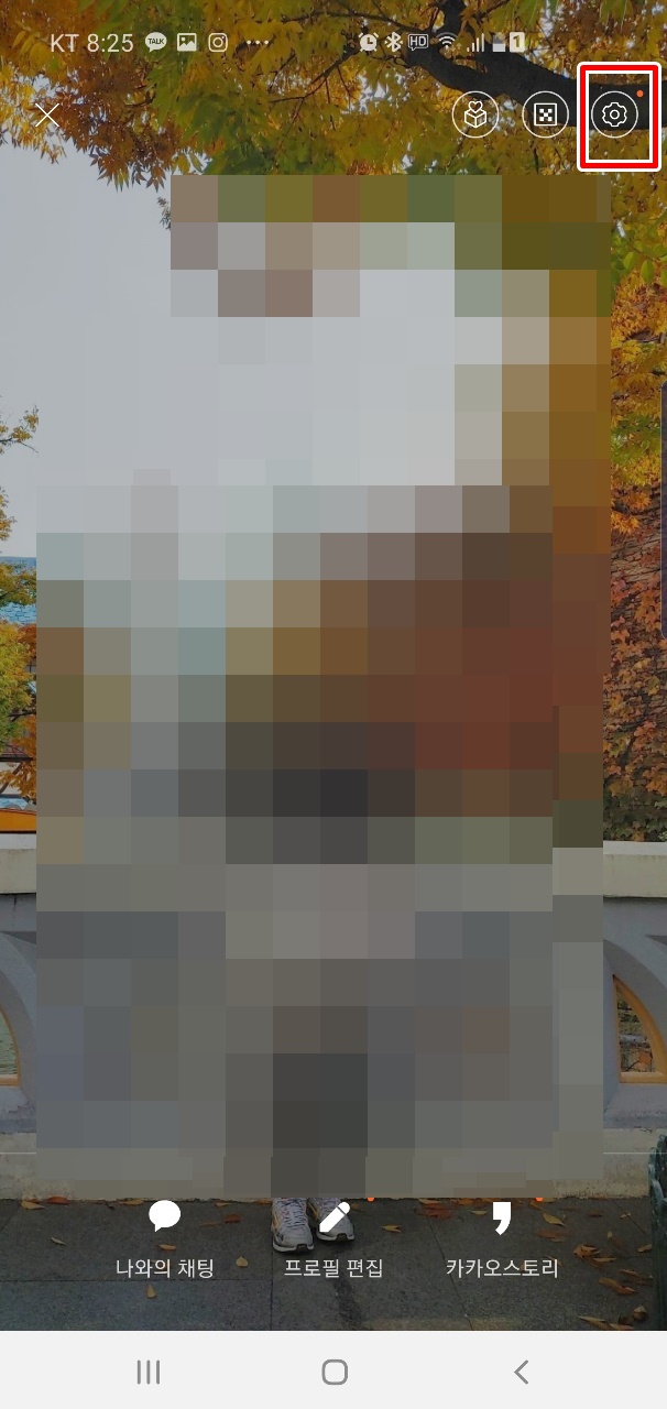 카카오톡 메인화면에서 나의 프로필을 클릭한 후> 오른쪽 상단 맨 오른쪽 톱니바퀴(설정) 버튼을 누릅니다.