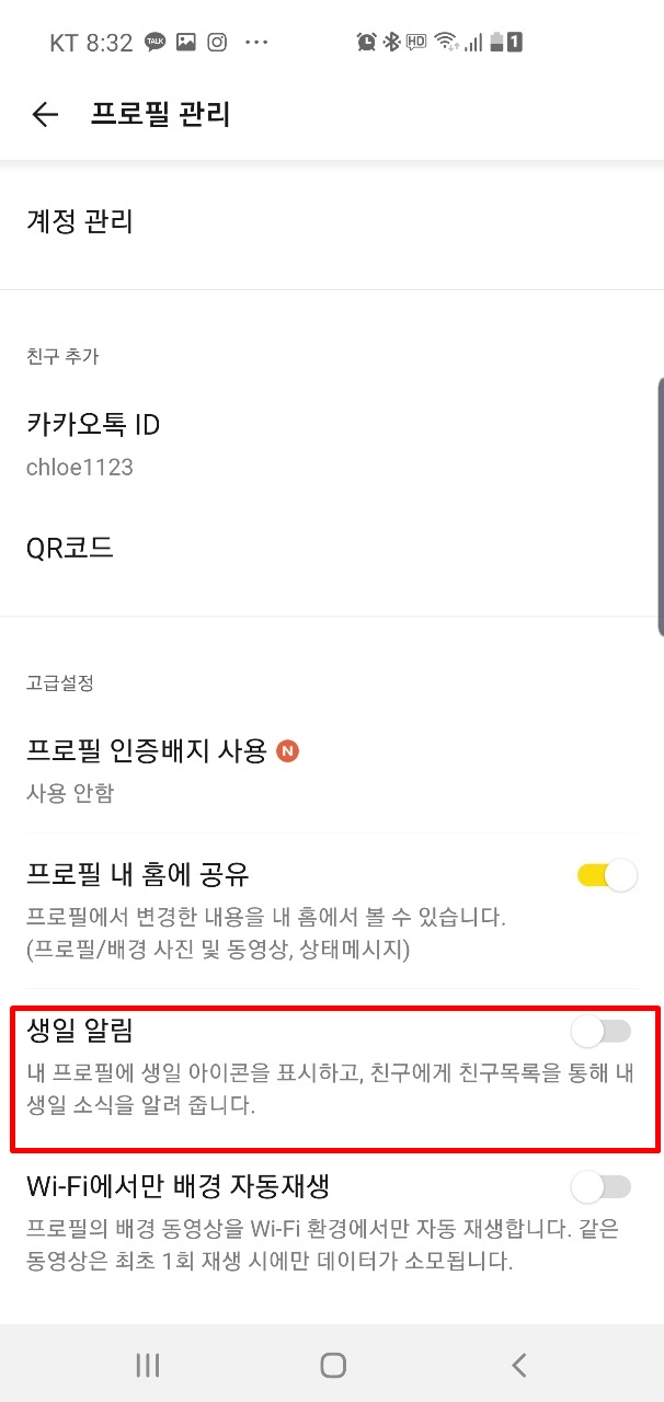 '프로필 관리' 카테고리가 뜨면 맨 아래로 화면을 내려 '생일 알림'란을 확인합니다.