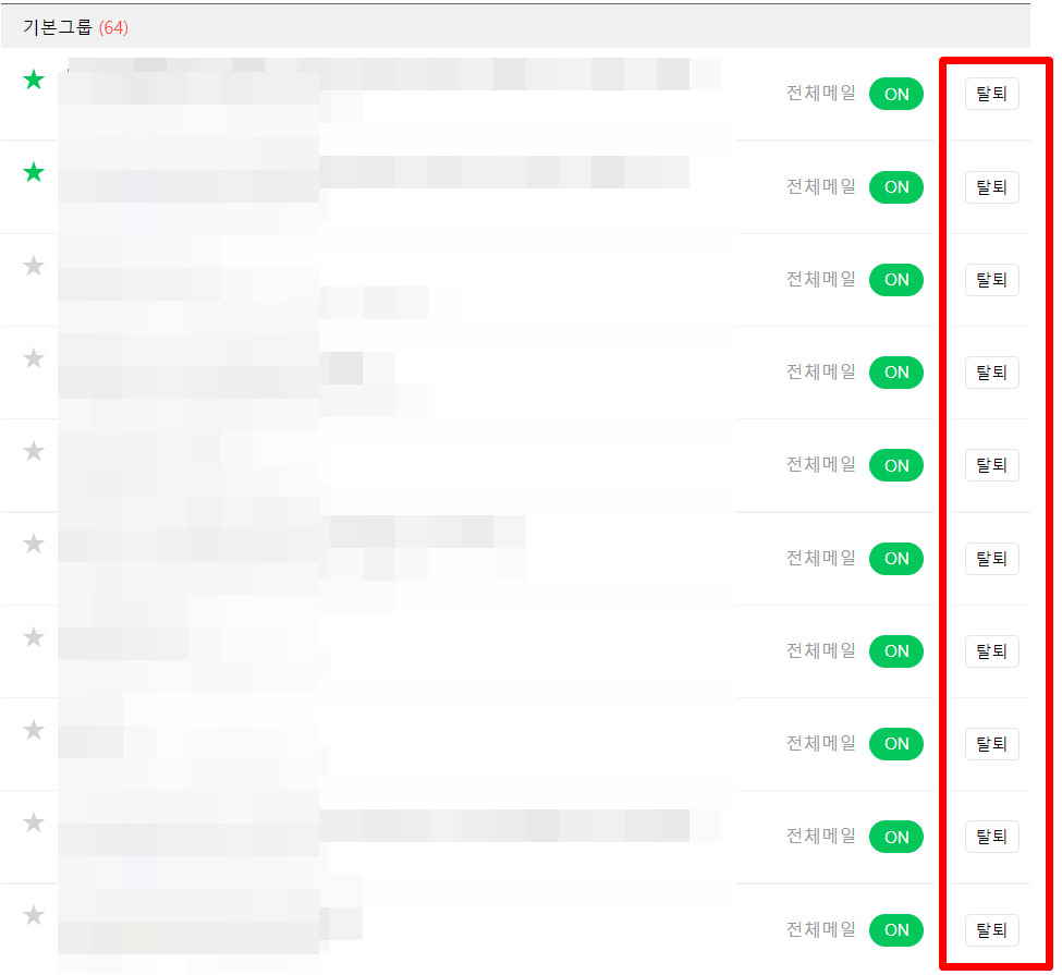 전체 메일 수신거부를 원한다면, 탈퇴 옆에 '전체 메일 on' 초록버튼을 한번 더 눌러 비활성화시켜주시면 됩니다.