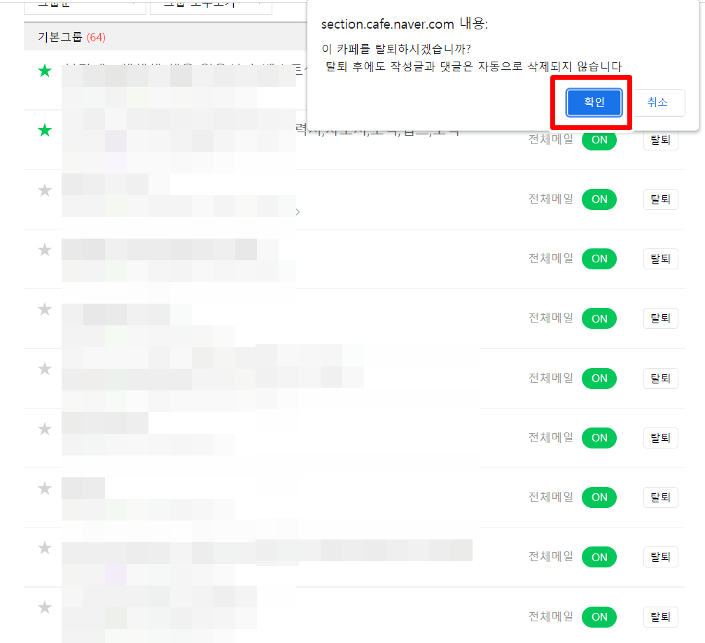 2. 아래와 같이 각 카페에 직접 들어가지 않아도 맨 우측에 탈퇴 버튼이 생성됩니다. 탈퇴를 원하시는 카페란에서 탈퇴를 누르고, 안내창이 나오면 '확인'을 눌러줍니다.