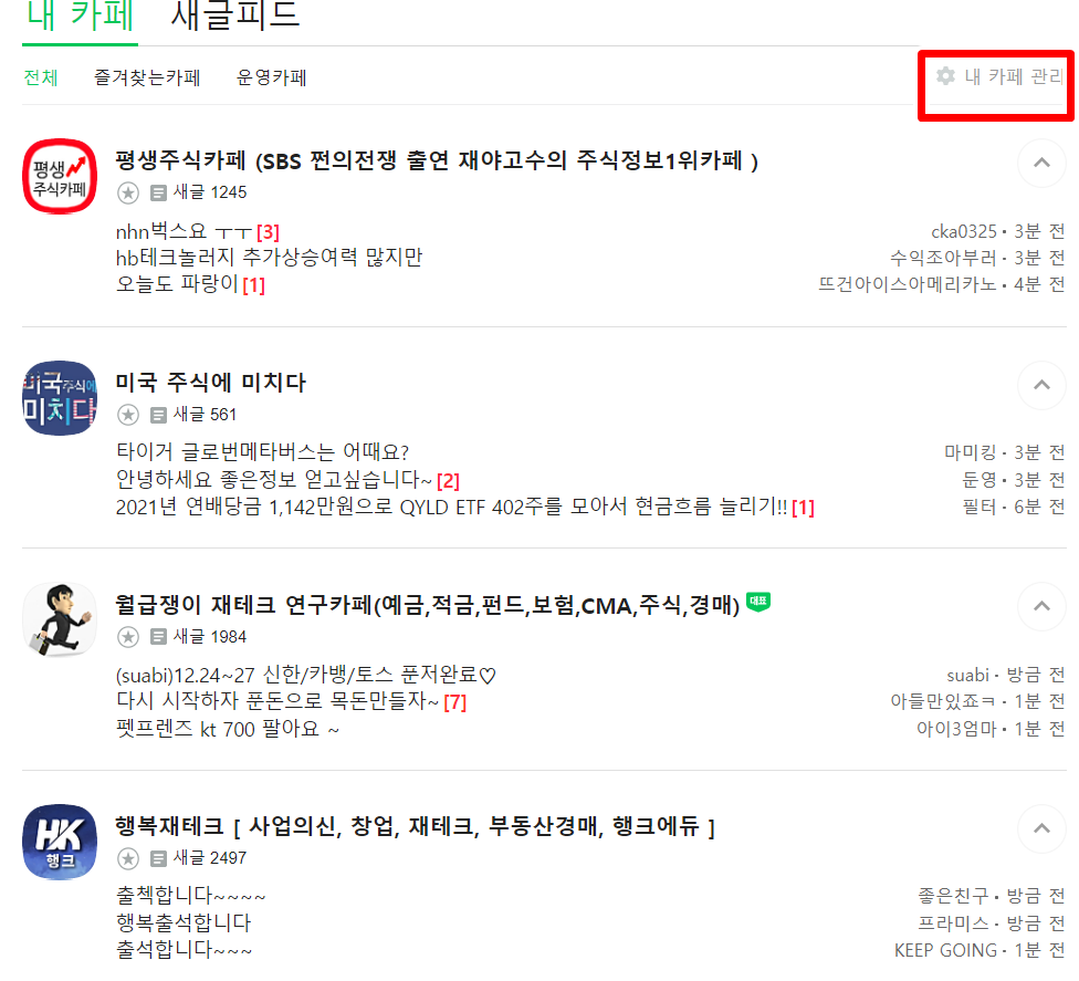1. 우선 네이버에 로그인하여 카페 탭으로 들어갑니다. 그 후 메인회면의 우측 상단에서 '내 카페 관리'를 클릭합니다.