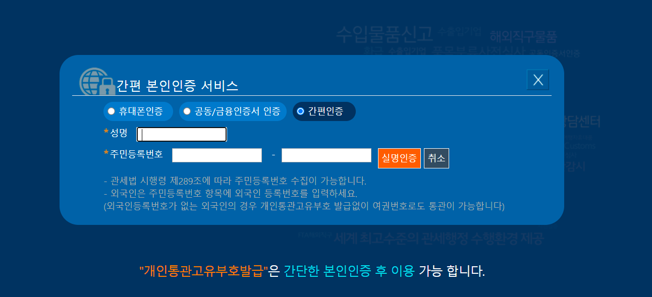 "개인통관고유부호발급"은 간단한 본인인증 후 이용 가능 합니다.