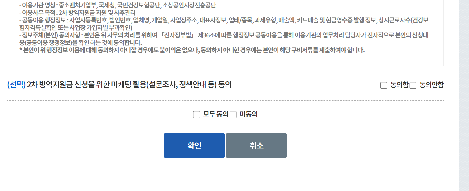 2. 2차 방역지원금 란의 신청하기를 누르면 안내서가 나오고, 모두 동의하기를 클릭합니다